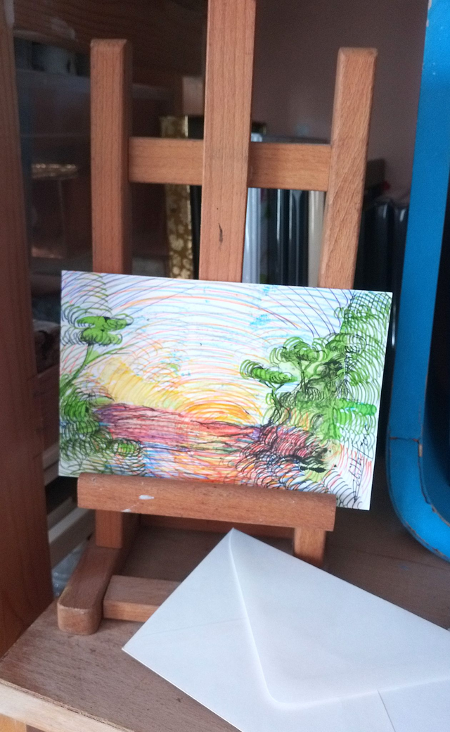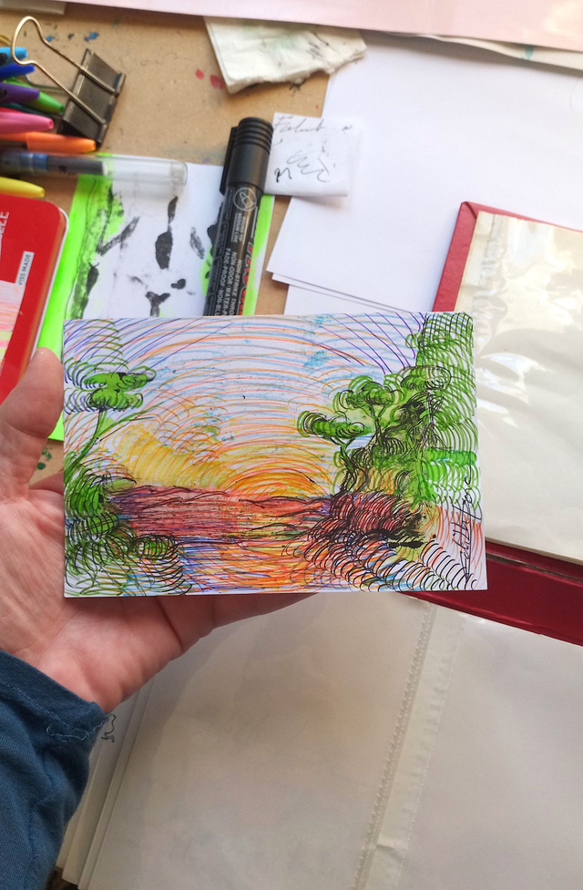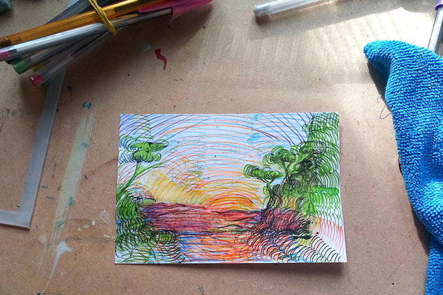 Dessin réalisé au crayon, marqueurs et stylo bille sur papier format carte postale - 10 x 15 cm.