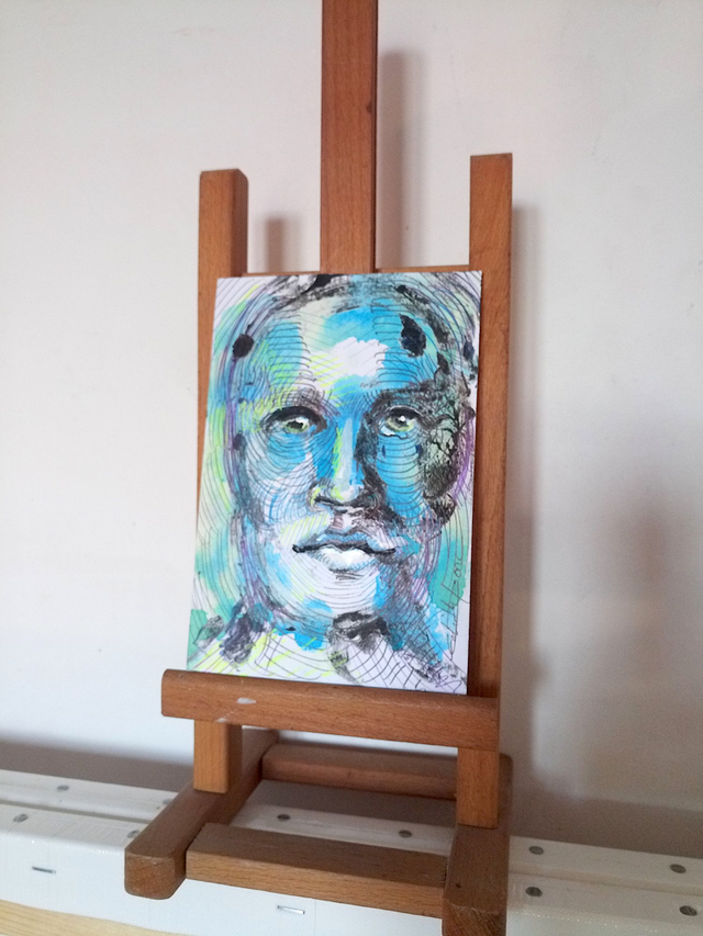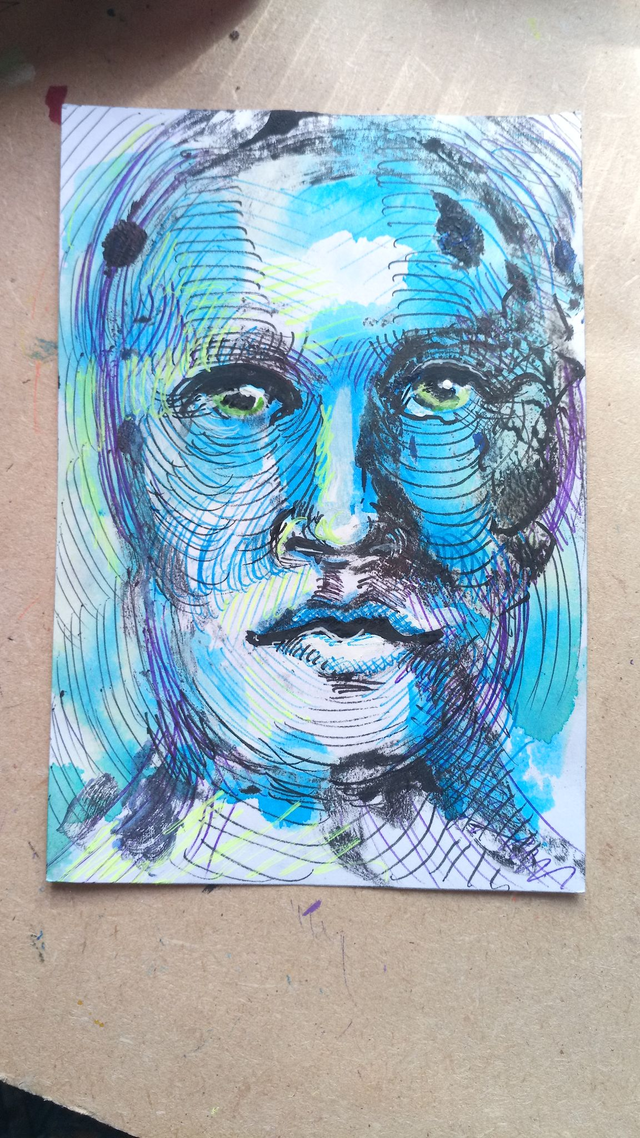 Monotype à l'huile, encre et feutres sur papier format carte postale.
